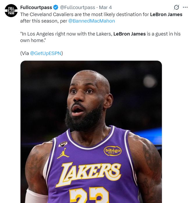 根據(jù)ESPN記者麥克梅納明的說法,在本賽季結(jié)束后,詹姆斯最可能加盟的球隊(duì)是克利夫蘭騎士隊(duì)。勒布朗在湖人的處境就是湖人的副駕駛都坐不下了,因?yàn)楦瘪{駛是里夫斯的位置,詹姆斯已經(jīng)被擠到后座了。
