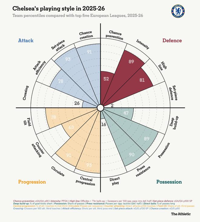The Athletic最新更新的比賽風(fēng)格分布圖有助于將這一弱點(diǎn)置于背景中。雖然我們可以看到切爾西是一支強(qiáng)大的控球型球隊(duì),在馬雷斯卡和羅塞尼爾指導(dǎo)下能夠很好地傳導(dǎo)球以創(chuàng)造高質(zhì)量機(jī)會(huì),但在防守定位球方面,他們發(fā)現(xiàn)自己處于歐洲五大聯(lián)賽所有球隊(duì)中墊底的2%之列。