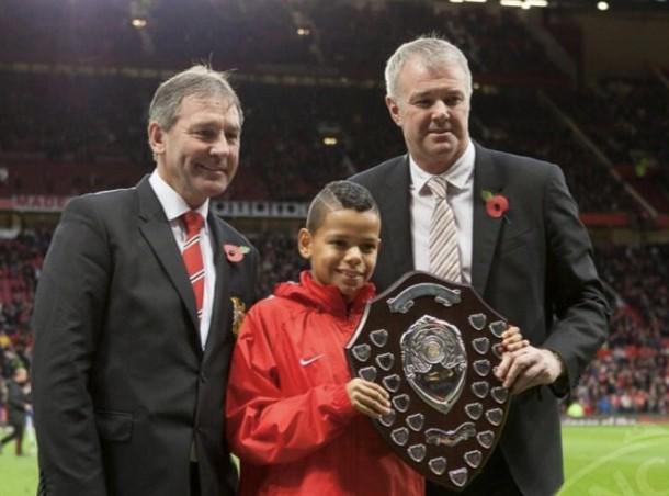 帖子里有一張照片:一個(gè)穿著亮紅色外套的11歲男孩,在老特拉福德球場(chǎng)的草坪上,從俱樂部傳奇布萊恩-羅布森和加里-帕里斯特手中接過冠軍獎(jiǎng)杯。那場(chǎng)頒獎(jiǎng)是在曼聯(lián)對(duì)陣水晶宮的英超比賽之前進(jìn)行的。